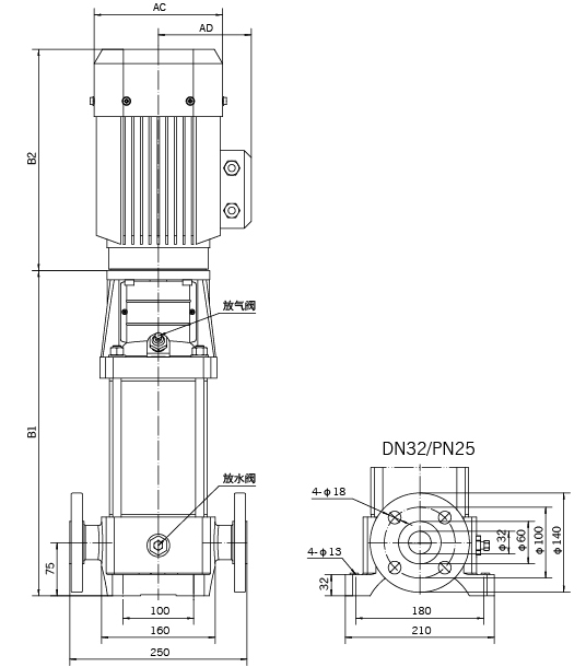 進出口口徑: DN25 DN32 DN40 DN50 DN50 DN50 DN65 DN80 DN100 DN100 DN125 DN125 DN150