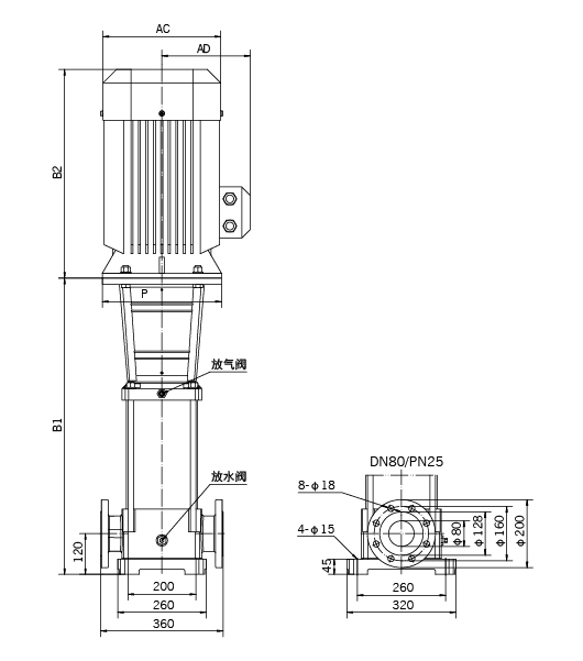 進出口口徑: DN25 DN32 DN40 DN50 DN50 DN50 DN65 DN80 DN100 DN100 DN125 DN125 DN150